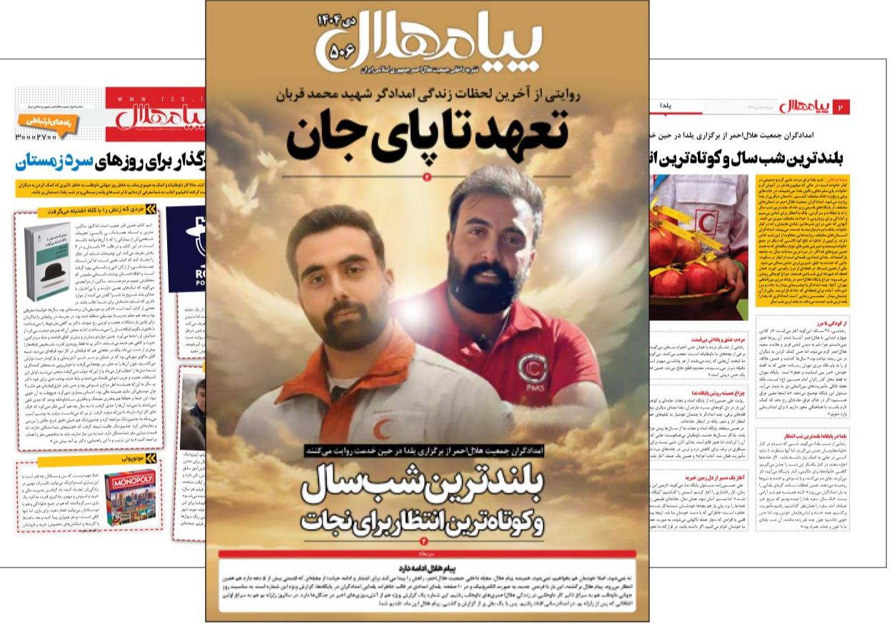 به گزارش پایگاه اطلاع رسانی جمعیت هلال احمر؛ شماره 506 پیام هلال که روایتی از آخرین لحظات زندگی امدادگر شهید محمد قربان در آن آمده است، منتشر شد.
