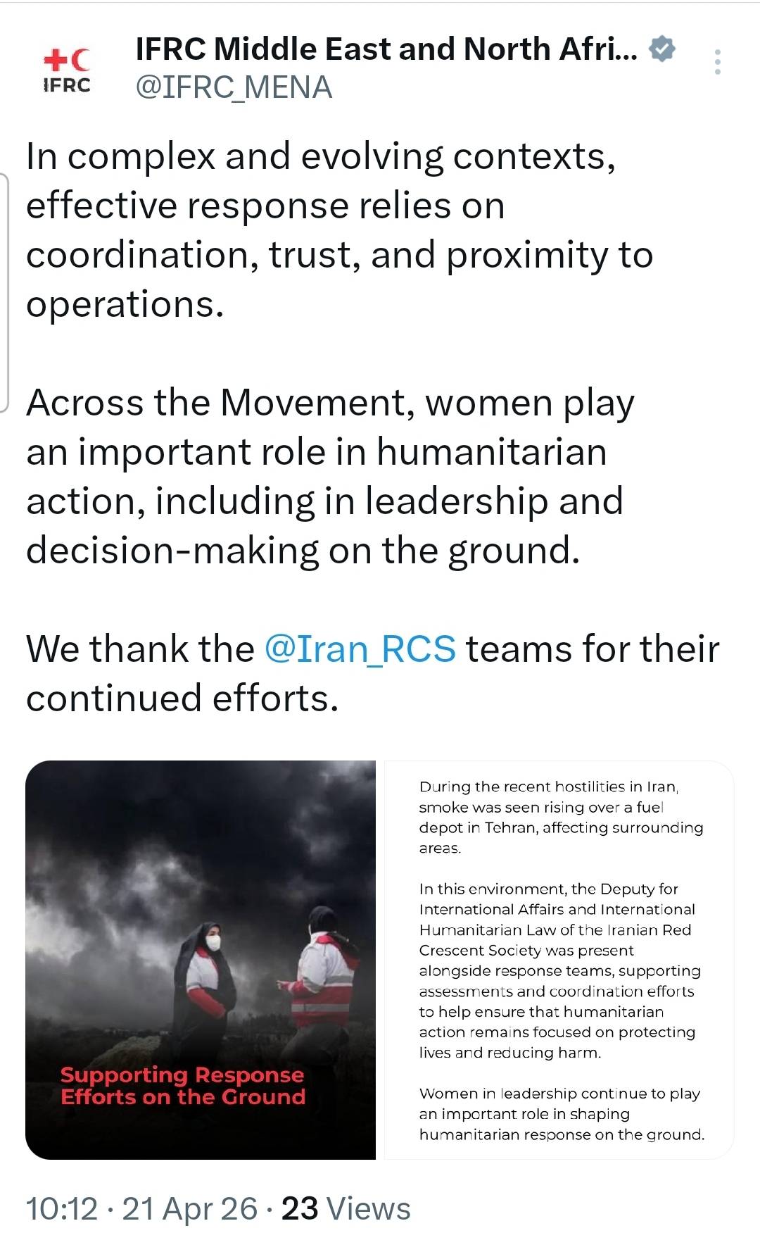 در توضیح تصویری که در این پست منتشر شده، آمده است: در جریان مخاصمات اخیر در ایران، مشاهده شد که دود از یک انبار سوخت در تهران به هوا برخاسته و مناطق اطراف را تحت تأثیر قرار داده است.در این شرایط، معاون امور بینالملل و حقوق بشردوستانه جمعیت هلالاحمر جمهوری اسلامی ایران در کنار تیمهای عملیاتی حضور داشت و از روند ارزیابیها و هماهنگیها حمایت کرد تا اطمینان حاصل شود که اقدامات بشردوستانه همچنان بر حفظ جان انسانها و کاهش آسیبها متمرکز باقی میماند.زنان در جایگاههای رهبری همچنان نقش مهمی در شکلدهی به پاسخهای بشردوستانه در میدان ایفا میکنند.