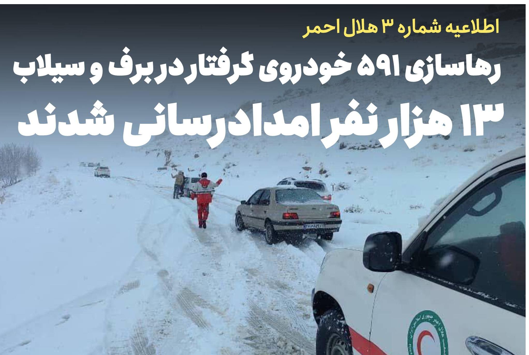 ۲. در این بازه زمانی، ۱۱۹ شعبه هلال احمر در ۱۶۳ نقطه عملیاتی فعال بودهاند و علاوه بر امدادرسانی، ۷۰ نفر از هموطنان متاثر از سیل و برف و کولاک را در این مدت به مناطق امن انتقال دادند. ۹ نفر از مصدومان نیز به مراکز درمانی منتقل شده و ۲ مصدوم دیگر در استانهای آذربایجان شرقی و فارس بهصورت سرپایی درمان شدند. یک عملیات فنی نیز برای نجات یک هموطن در استان فارس به انجام رسید.