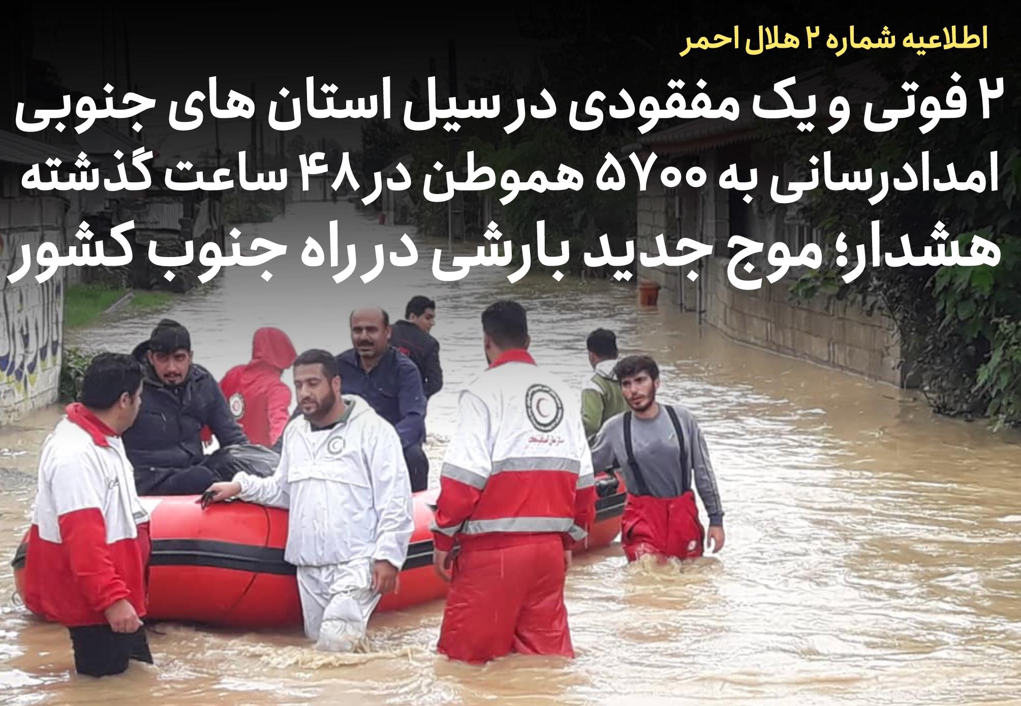 جمعیت هلالاحمر در اطلاعیه شماره ۲ علاوه بر اعلام خدماترسانی به بیش از ۵۷۰۰ نفر در برف و کولاک و سیلاب اخیر، از آمادهباش تیمهای امدادی با ورود موج جدید بارشی به مناطق جنوبی کشور خبر داد و به هموطنان در این مناطق توصیه کرد که برای حفظ سلامتی و پیشگیری از خسارات جانی و مادی ناشی از بارشهای شدید، نکات ایمنی لازم را رعایت کنند.