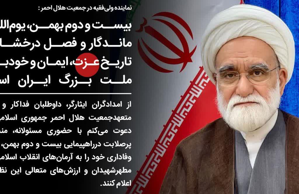 نماینده ولی فقیه در جمعیت هلال احمر با صدور پیامی از عموم مردم شریف ایران به ویژه خانواده بزرگ جمعیت هلال احمر برای حضور پرشور در راهپیمایی ۲۲ بهمن دعوت کرد.