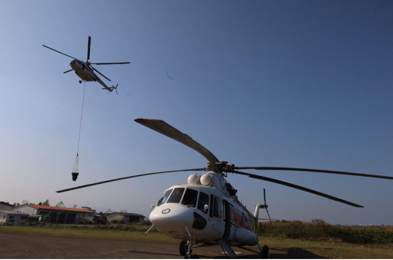 رئیس سازمان امدادونجات با اشاره به نقش محوری امداد هوایی بیان کرد: «سه فروند بالگرد حاضر در منطقه، مجموعاً ۴۶ سورت پرواز انجام دادند و ۱۰۸ هزار لیتر آب بر کانون‌های حریق تخلیه کردند. همچنین ۸۹ نفر از نیروهای عملیاتی نیز توسط بالگردها جابه‌جا شدند.»