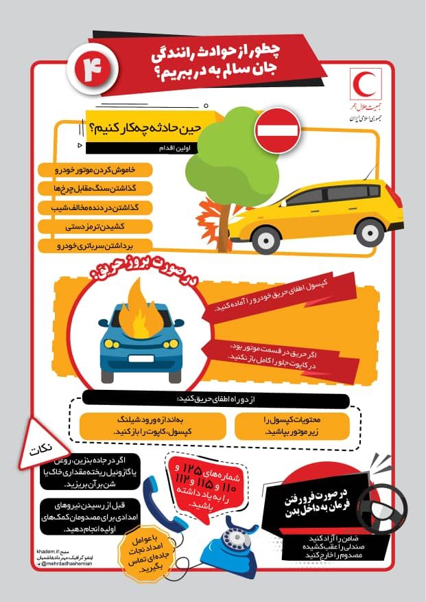 - برای امدادرسانی سریع به مصدومان تصادفات، راه را برای آمبولانسها و نیروهای امدادی باز کنید و از ازدحام در محل حادثه بپرهیزید.