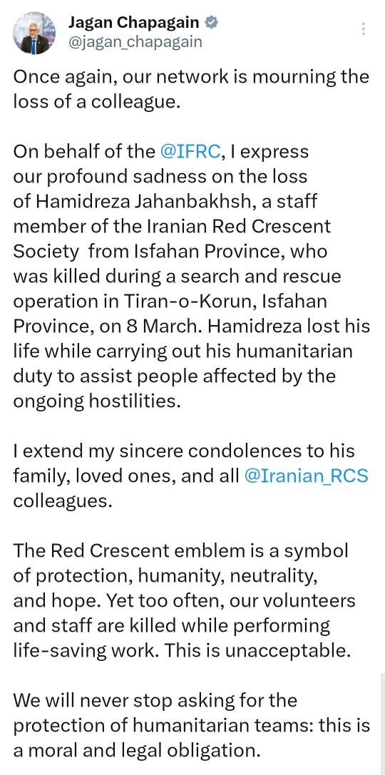 به گزارش پایگاه اطلاع رسانی جمعیت هلال‌احمر؛ پست آقای جاگان چاپاگان دبیرکل فدراسیون بین‌المللی جمعیت‌های صلیب‌سرخ و هلال‌احمر در شبکه اجتماعی ایکس: